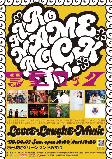 【出演】 ⽚⼭ブレイカーズ&ザ⭐︎ロケンローパーティ しもぐち雅充とモーニングスタンダップ Trash feat.アヤヲ リリィ喜代⼝&ホセ雅⼝ THE イナズマ戦隊 花*花 平松愛理 地球から 2 ミリ浮いてる⼈たち はてな︖ 【チケット詳細】 ローソンチケット/グリーンランドみずほ/丹波ワインハウス/京丹波町観光協会 Live House「AKKUNʼS」/キラボシ/Oi coffee/タルタルクラブほかにて販売 ▪️4 ⽉ 18 ⽇(⼟)販売スタート▪️ 【主催】 ⿊⾖ロックフェスティバル実⾏委員会 協⼒ / グリーンランドみずほ(株) 後援 / α-STATION(FM 京都)、ABC ラジオ、FM ⼤阪、e-radio(FM 滋賀)、 京丹波町、京丹波町観光協会 【お問合せ】 ⿊⾖ロックホームページ https://kuromamerock.com/ |