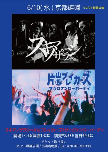 スキマノザラシとのツーマンリベンジ!! 【出演】 片山ブレイカーズ&ザ☆ロケンローパーティ スキマノザラシ 【チケット情報】 ※3/12販売開始 ※販売場所:磔磔店頭 / 出演者物販 / Bar ANGIE MOTEL ※各バンドホームページでも受付けています。 【予約受付フォーム】 https://k-breakers.com/schedule/ticket/input/121309 ※ 2月27日(金)の振替公演です。2月27日のチケットをお持ちの方はご使用いただけます。 払い戻しを希望される方は、6月10日までに磔磔にお持ちいただくか、購入された出演者の物販にて払い戻しいたします。 【お問合せ】 075-351-1321(磔磔) |